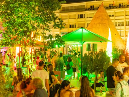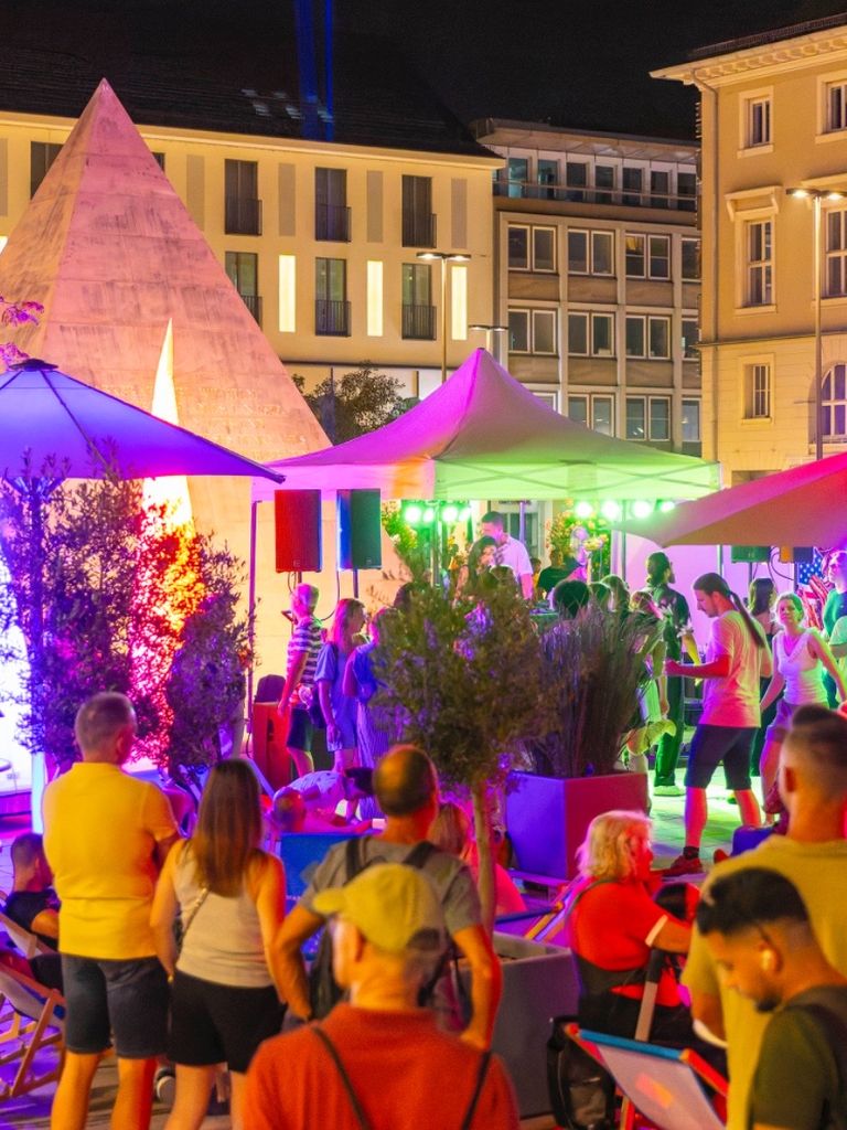Unter dem Motto „Lounge 76 am Marktplatz“ wird die Fläche rund um die Pyramide in eine stilvolle Open-Air-Lounge verwandelt.